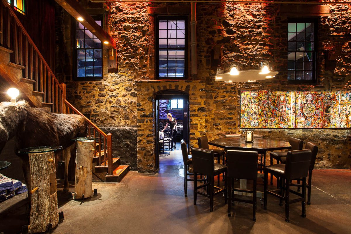 Plats québécois copieux concoctés par le chef Martin Picard, avec entre autres du foie gras et du porc, servis dans un espace animé.